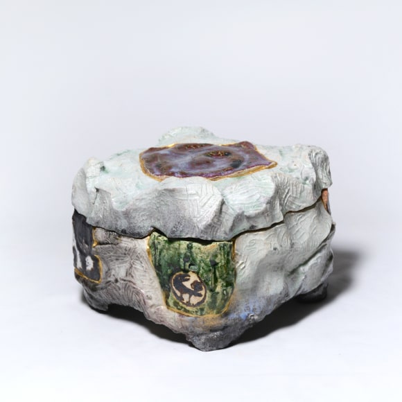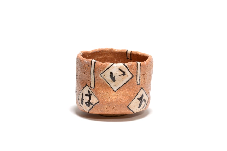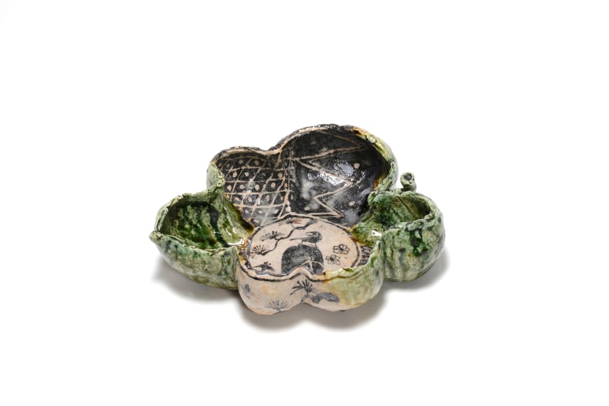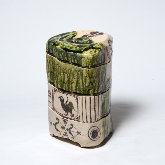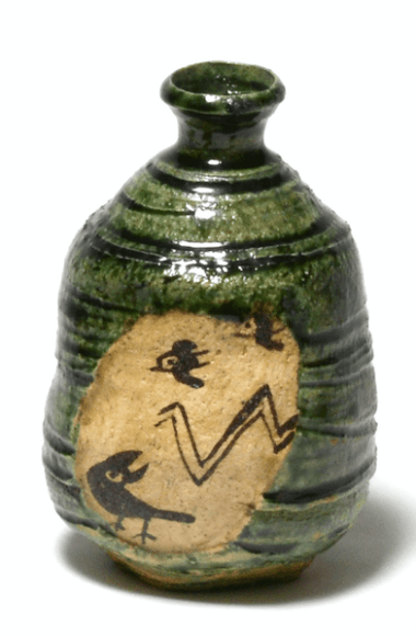 Japanese master ceramist Goro Suzuki works in the centuries-old Oribe style. Originally from the 17th century, Oribe ware features simple design motifs based on fanciful combinations of squares, rectangles and circles. The artist adds dipped or poured accents of a green flowing glaze.