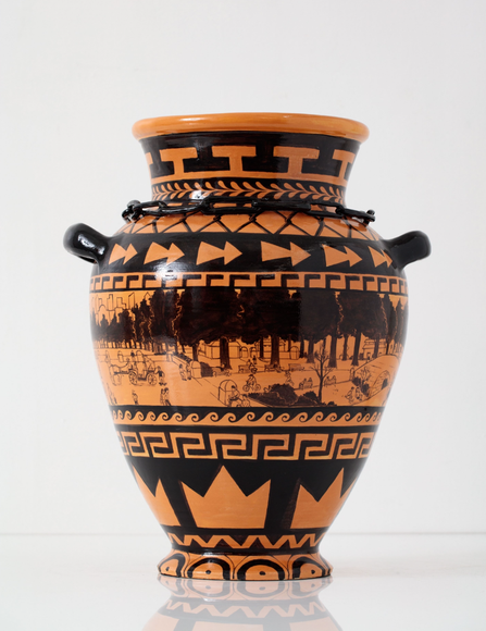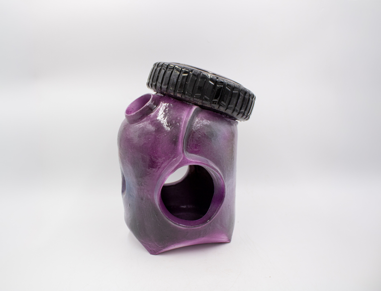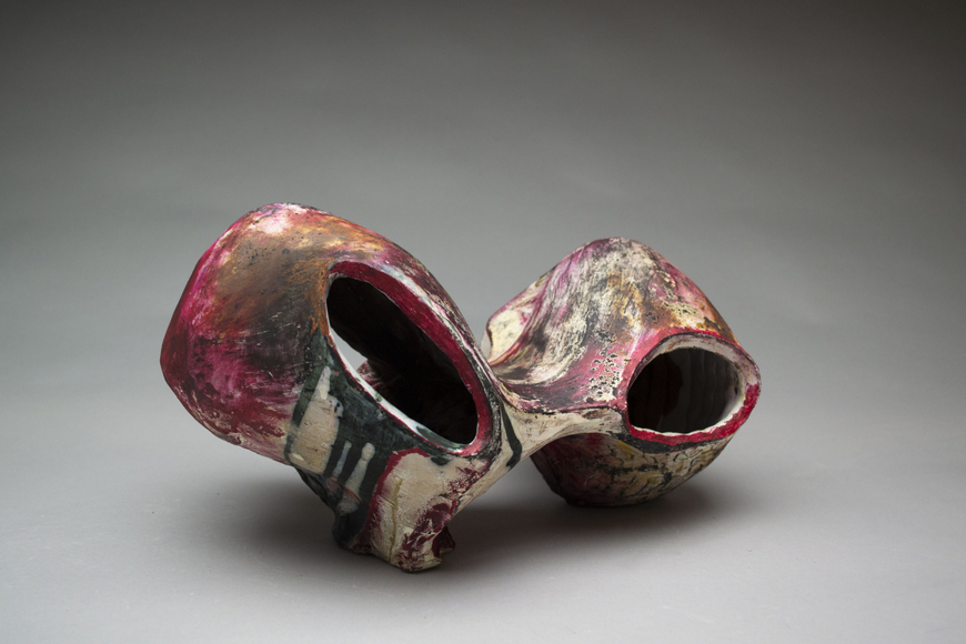 Red earthenware, glaze, found object, spray paint