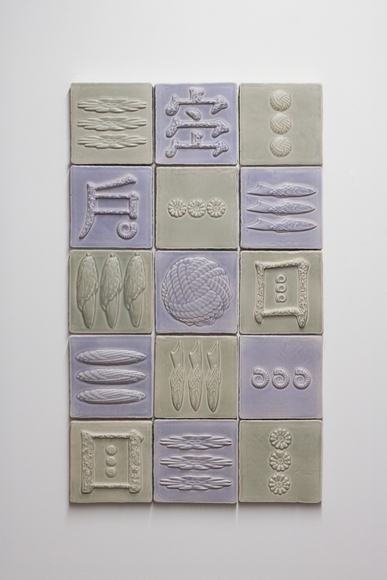 Earthenware, underglaze, batik fabric, wood
