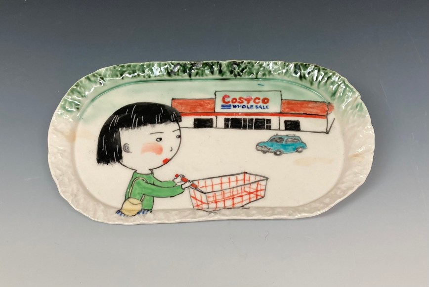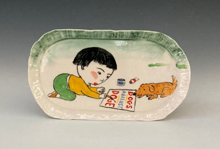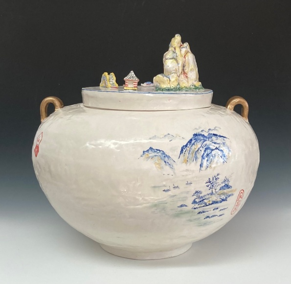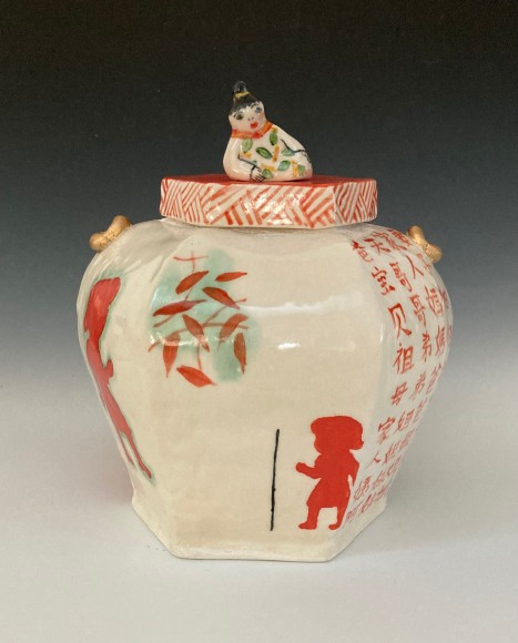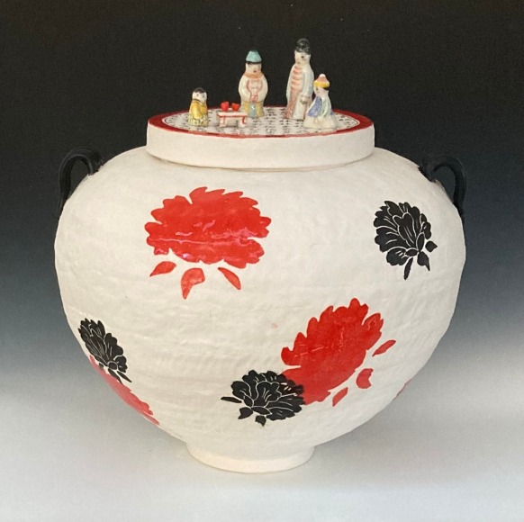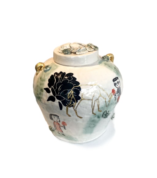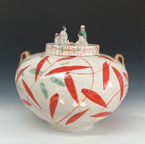 Lo’s dismay at the election results first took shape in the form of tiny, china-painted figures. Initially modest in scale, these figures began to assert a surprising presence once placed on voluminous, expansive pots. Their influence within the larger environment became clear. This is shown in the piece Ancestors Jar (Red Leaves),where the large jar’s lid is topped with detailed figures. Lo realized that small figures could carry significant weight—both visually, in shaping the composition, and conceptually, as a social commentary. “Small actions and telling our stories can make a difference, “she reflected. See Inheritance Vase and Small Inheritance Jar Black.