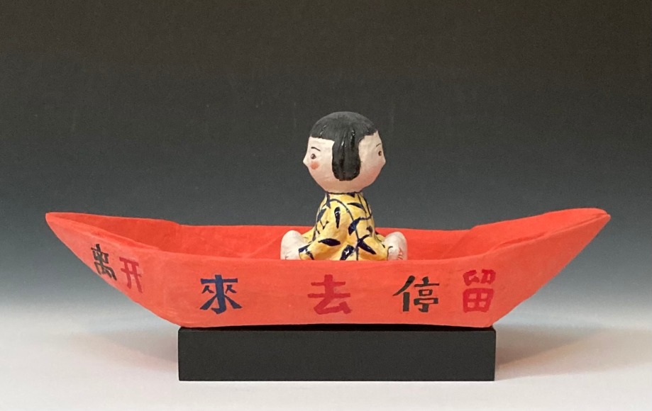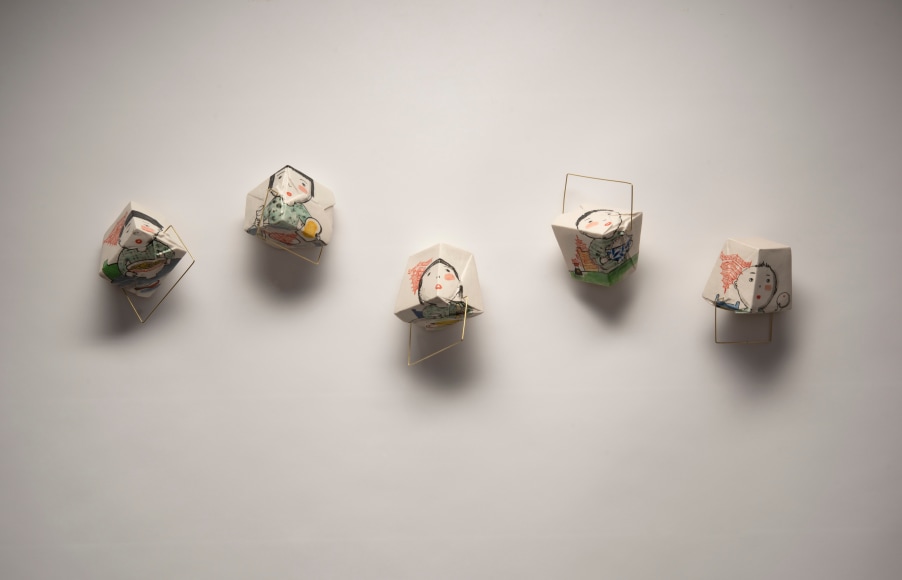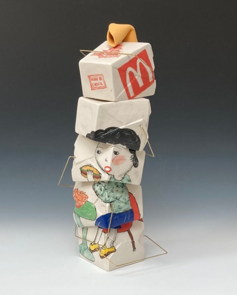 Lo’s sculpture celebrates family and evokes childhood experience of wonder and surprise. It hints at something beyond the mundane and expresses the dual nature she experienced growing up as a minority female in the United States as in Chinese American Takeout Tower. As the artist states “My art-making process, always related to a sense of art’s social responsibility, eventually led me to the more directly politicalAmerican Heroes series, which specifically critique the current administration policies.”