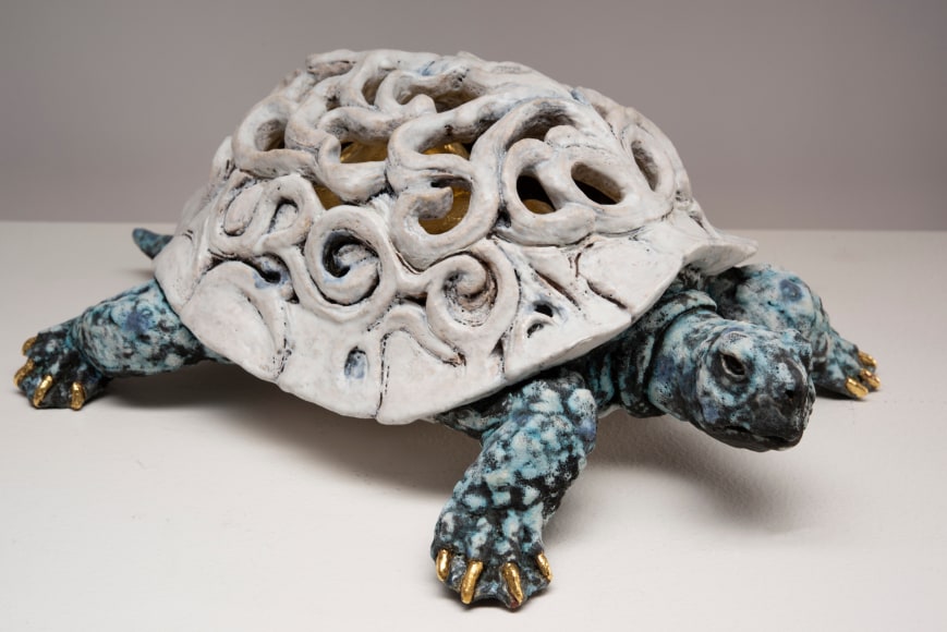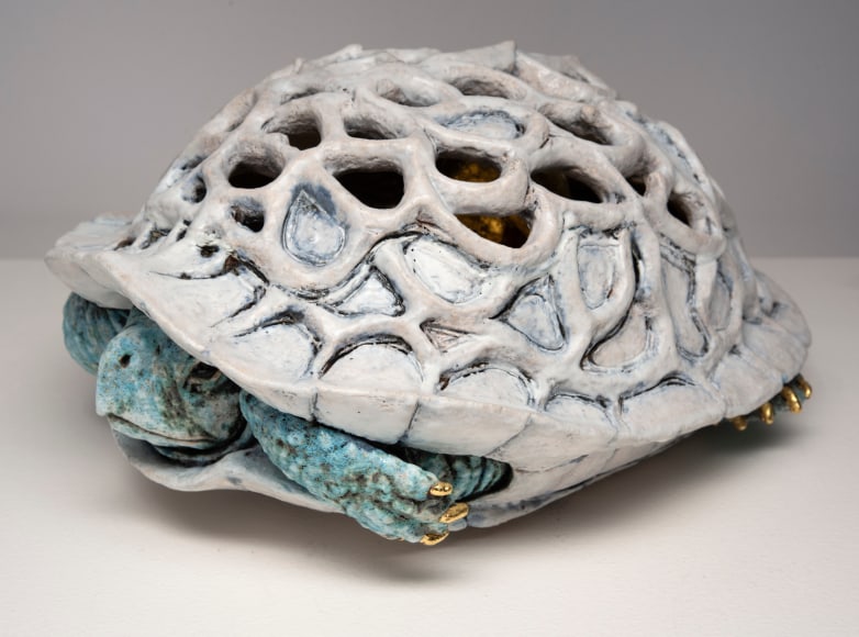 For Arleo, the impulse to “hide and be small” impulse manifested first with the three turtle pieces titled “Carapace I, II and III”. For the artist the self-protective nature of the turtle, with its ability to withdraw within itself under the shield of its shell, felt like an appropriate image for this moment in time. These three pieces have carved shells that reveal figures within them. Here the artist makes visible an interior experience of self that is usually unseen or hidden. The exterior “facade” implies one type of being, while the internal one, glimpsed in the see-through areas, reveal something entirely other, or unexpected.