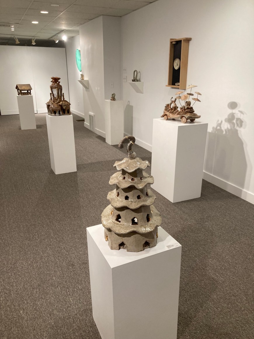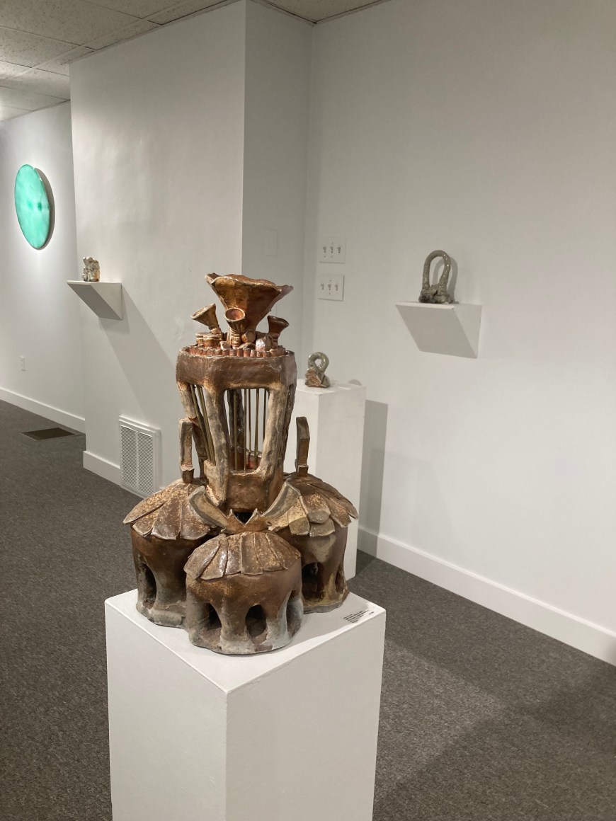 Social Circus is representative of a large circus tent that houses many people and a variety of spectacles. Roche is fascinated with the idea of the structure containing many minds, talents, and perspectives under one roof in a chaotic and beautiful mixture. The arrow on top signifies the urge to be heard and the need to gather people to an attraction. It is one of three pieces relating to architecture.  These pagoda-like forms, highlighted by the ash of wood-fire, speak volumes about what happens inside spaces.