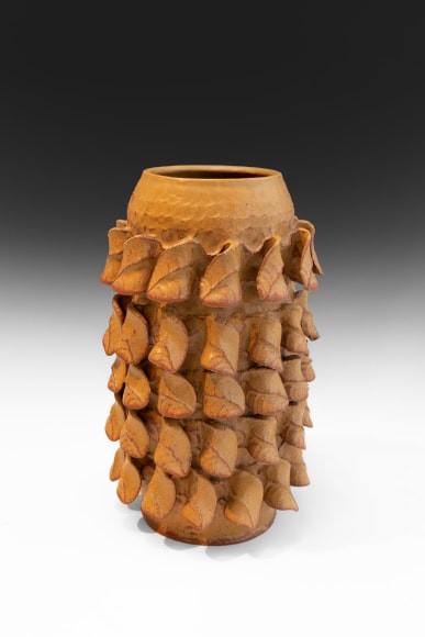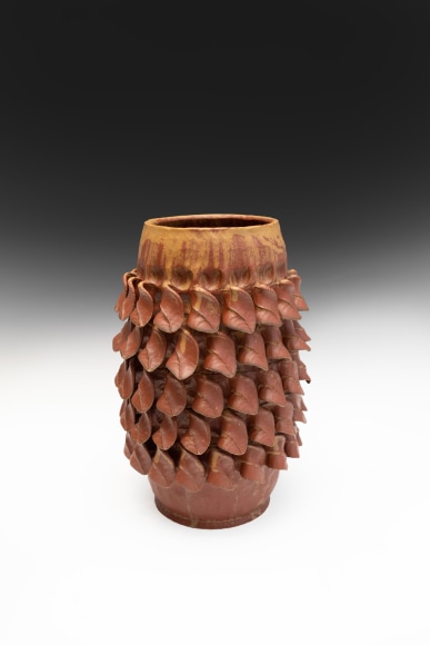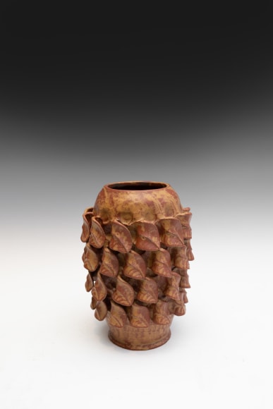 It is not just the surface of this new work that is fresh for me, but also the freedom to purely pinch and the courage to push beyond my skill set for a number of these pieces challenged my abilities and were always on the cusp of being lost. These are the largest pieces I have pinched to date out of one piece of clay. I have named this pinched series Caltrops. I was reminded of the black water chestnuts (also called water caltrops, trapa nuts, bat nuts, devil nuts), that I played with growing up near the Hudson River. They were so beautiful and menacing at the same time. After research on them I learned they bore the name caltrop which also references a Roman spiked jack-like weapon with similar points to these water chestnuts. They were strewn on the ground to impede the progress of enemies as the sharp edges of the objects penetrated sandals, hooves, and chariot wheels. I see the work both reflective of a very difficult time, which I am still working my way through, dealing with the new aggressions of these times, and facing current political and public health dilemmas. I can’t say that I set out to “make” this body of work, it spilled out of me. That doesn’t usually happen, I more often philosophize about my practice. But I think I have been quite drawn away from studio thinking which opened space for me to abandon some of the rules that I have put in place for previous series of work: symmetry, repetition, beauty, color through glaze or clay but the continuum of inside/outside remains palatable. I simply pinched for hours at a time until the piece was done and found that another beauty emerged from this dark night of the soul.