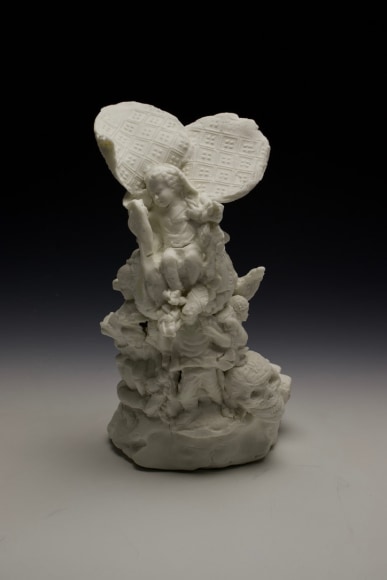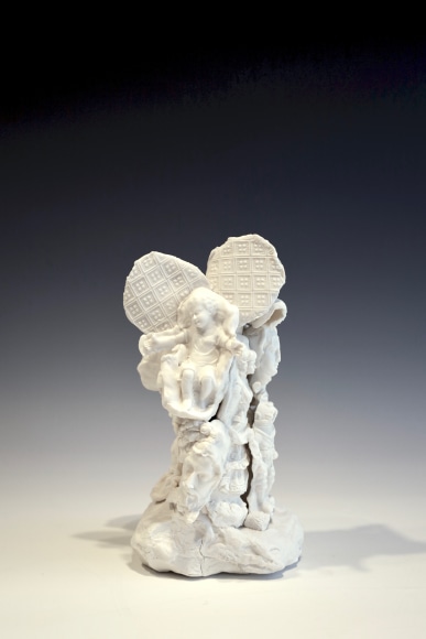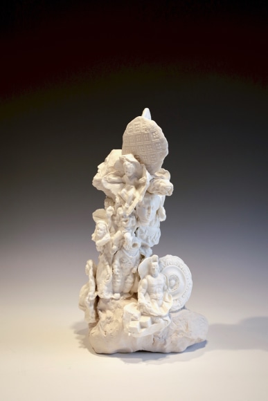 Yuh combines many references in his new monochromatic sculpture through the maximalist use of press-molded found objects. He alludes to the energy of Korea, found in the culture’s co-mingling of Zen Buddhism, Confucianism and Christianity iconography of Jesus and Buddha figures, and juxtaposes it with pop culture references of today such as Chewbacca and Batman. Also found are examples of humor in his use of casts of an Elmer’s glue bottle and corncobs. The white press-mold sculptures are reminiscent of classical Greek and Roman sculptures.