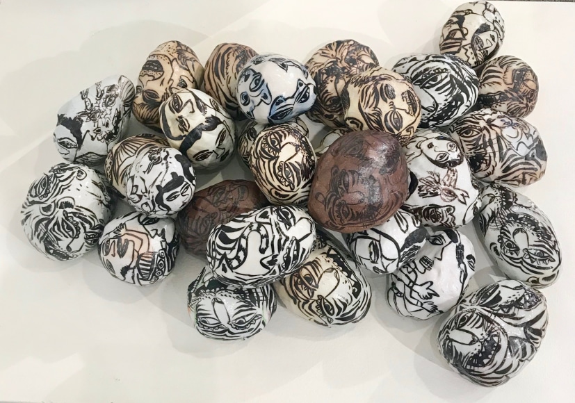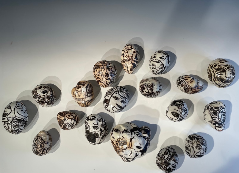 seen in the artist’s bold and revealing drawings in this exhibition and carry over to his Story Stones, hand-formed, then covered with drawings mostly black.