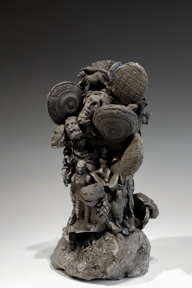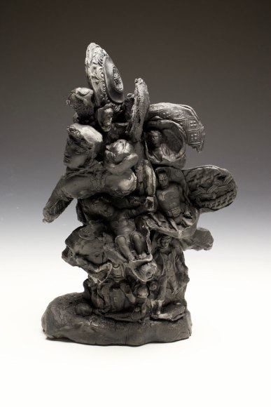 For many years, Yuh has wanted to evolve naturally from the large scale colorful, figurative ceramic sculpture for which he is known. In this exhibition, Old and New, the artist proceeds to try out four ideas. The first is to show the changes from his old work to his new work by using his existing works to reconstruct new pieces. The second is to change from representational to abstract, avoiding the figurative and narrative aspects of his work, to create abstract forms. Thirdly, in making sculpture in black or white, he lets go of his polychromatic glazes for which he has been known and uses the clay’s original colors of black and white unglazed. The fourth area he explores is the presentation of hand built, painted hollow forms in sculptures he calls Piles which continue his psychologically revealing drawings. These four changes allowed him to compose a new body of work for this exhibition.