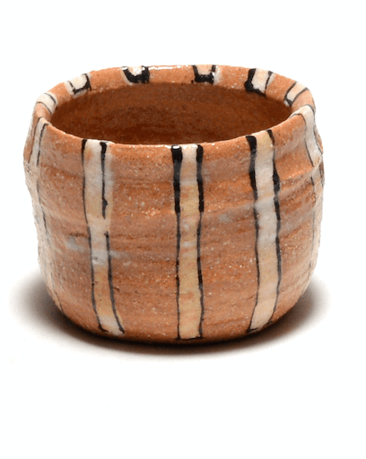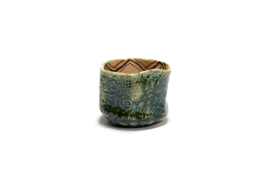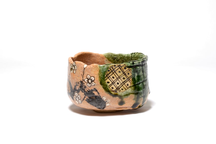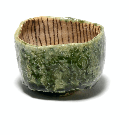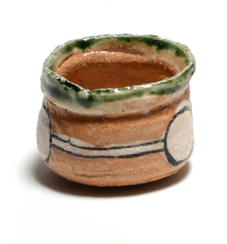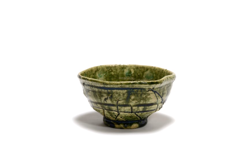 Oribe originated in the Momoyama period (1573 – 1615) in Japan. While thought of by most as a flowing green glaze, it can be many other colors, including red, black, and brown. Influenced by Japanese fabric design, it often includes drawings in asymmetrical shapes such as squares, rectangles, and circles, on which it is easy to expand, leading to infinite artistic expression. The innovative “Goro” style embodies the spirit of the Momoyama period (spontaneous flowing creativity) combined with his own iconic language drawing on memories of his youth and his life today.