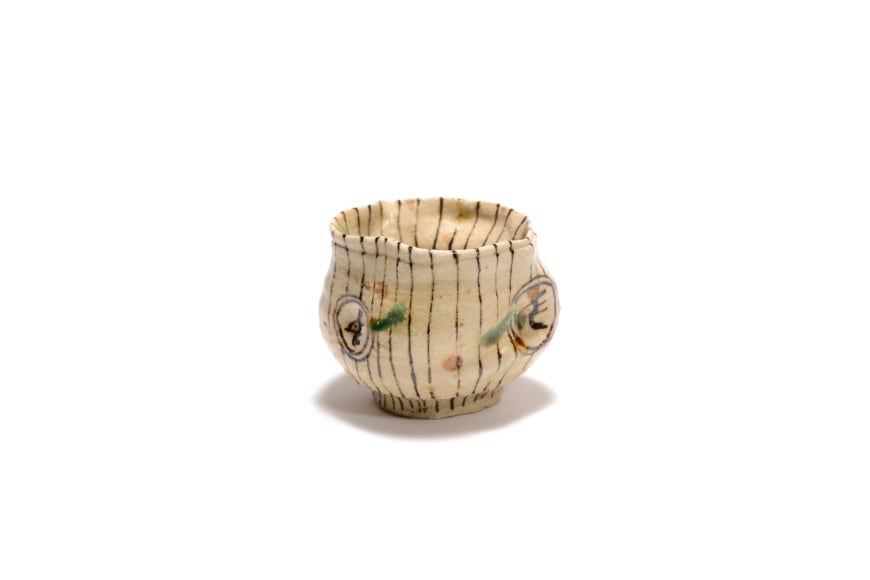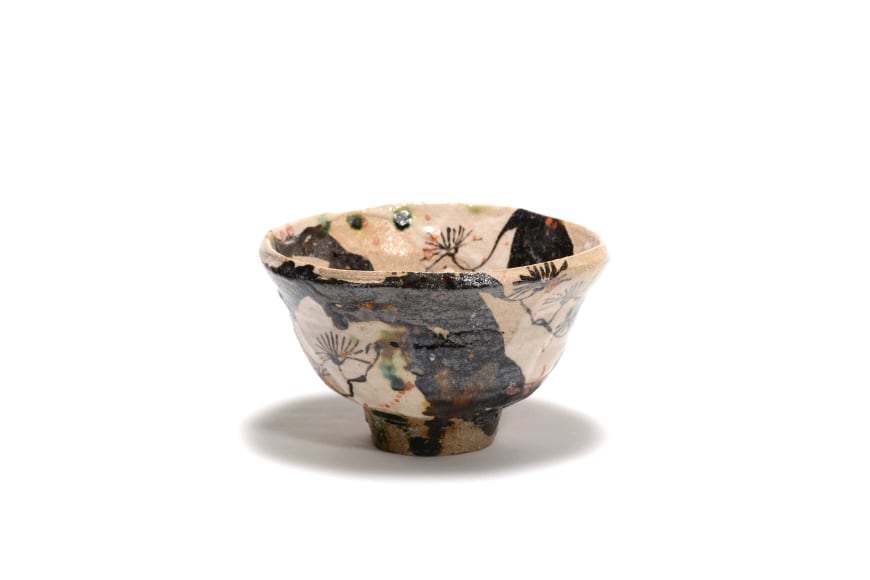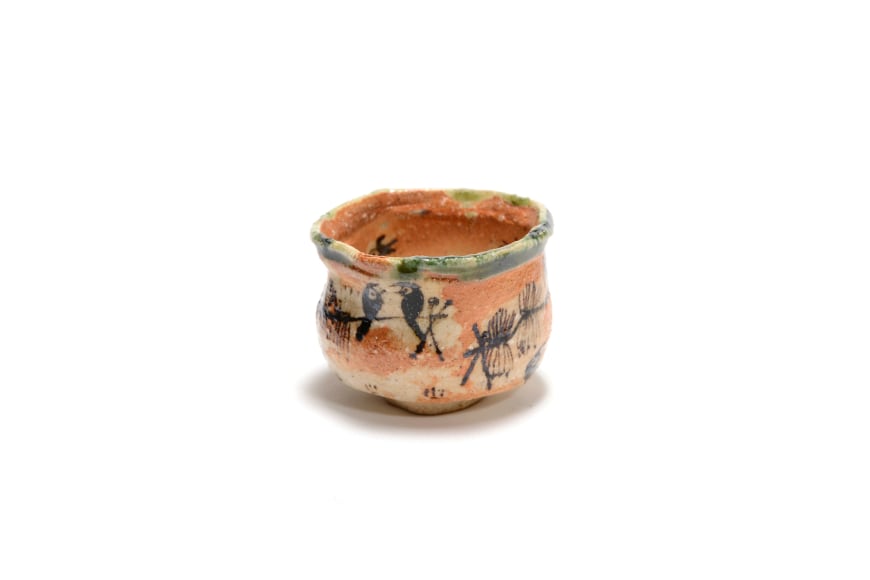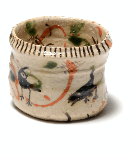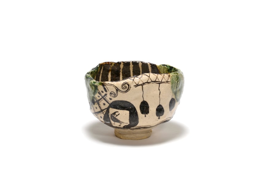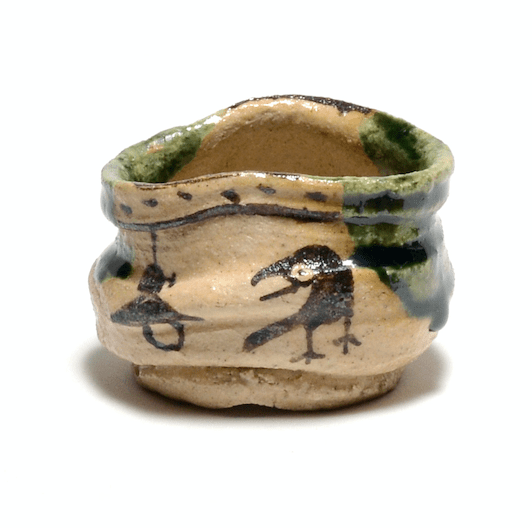 The picture drawn on the inside of the Tetsu E-Oribe ceramic box is a memento from long ago. In my childhood, I would load grass or vegetables into a pull-cart to carry them. That was my job. As a child, I raised crows from chicks. Crows left a very deep impression on me. I sometimes paint crows as self-portraits. In this show, those pictures appear on my Guinomi [large sake cups]. - Suzuki Goro, 2021