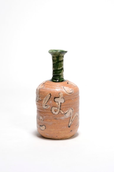 There are two ways of making Narumi Oribe. Put simply, in one method red clay is painted onto an Oribe clay, and in the other method Oribe clay is joined with the red clay. The works in this show are mainly made by the joining method. This is clear when you look at the Narumi tokkuri with script. The letters "I, ro, ha, ni, ho, he, to" as well as the letters on the Aka Chawan are from the old Japanese alphabet.