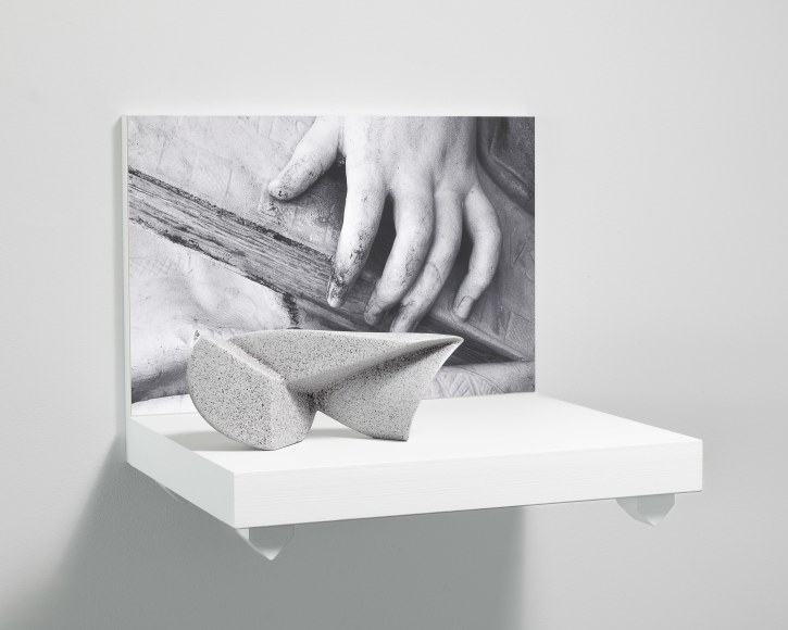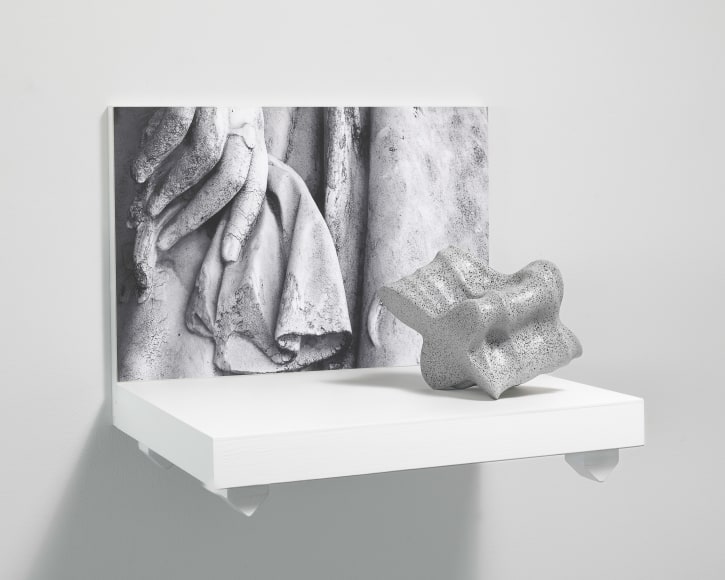 Anne Currier (b.1950), is known for formalist abstract sculpture, constructed from the point of view of clay slabs, cylinders and cones. For this exhibition, she has created a new conceptual series of works comprised of a photographic image and a ceramic object serving as ‘characters on a platformed stage’. The ceramic objects, made in her studio in 2022 are in combination with an image of hands from sculpture found in the Jardin du Luxembourg, taken in Paris in 2006.