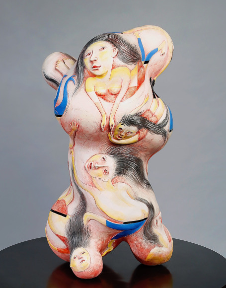 Patti Warashina (b.1940), considered a defining sculptor in West Coast Funk Art, is known for her ironic and surreal polychromed glazed ceramic sculptures, often autobiographical, which reflect commentary for issues ranging from feminist critiques of the art world to the internment of the Japanese during World War II. For most of her 60-year career the human figure has absorbed and fascinated her visual curiosity. Warashina was instrumental in bringing the Seattle ceramic scene to prominence, heading the department at the University of Washington, Seattle, where she received her masters and undergraduate degrees.