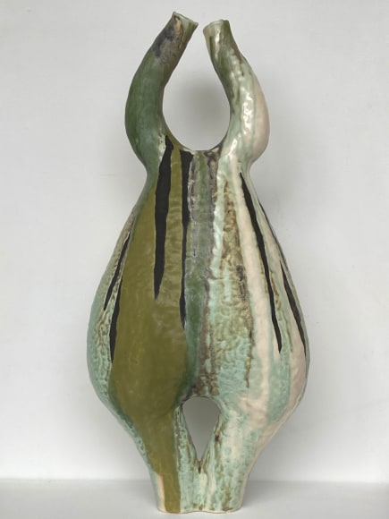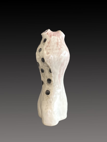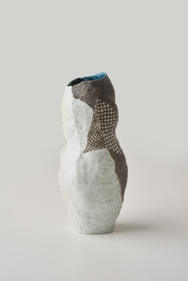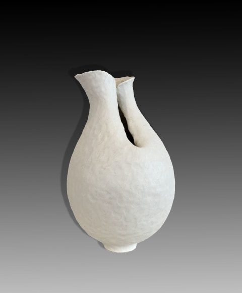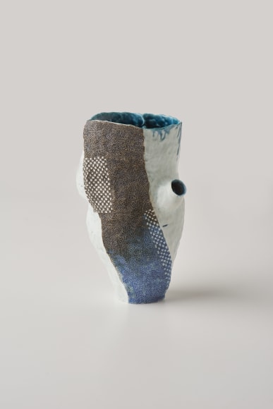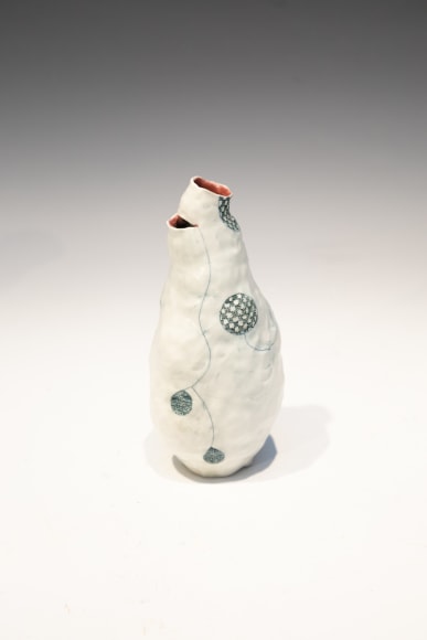 Clay excites me for its immediate and direct response to touch as I coil and pinch layers of porcelain to create vessels imbued with the intimacy of a finger-marked surface. The shapes of the ceramic vessels I produce are determined by the bases I create for them and how I alter their forms by pushing the walls from inside and out. I encourage the objects to morph and change as I create them, developing a language of improvisation through whimsy. The curves and twists of the vessels invoke sensuality that is spontaneous and in the spirit of the making. I am interested in touch both locally in the mark of the fingerprint and at distance in how these pieces relate to each other.