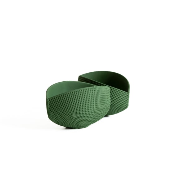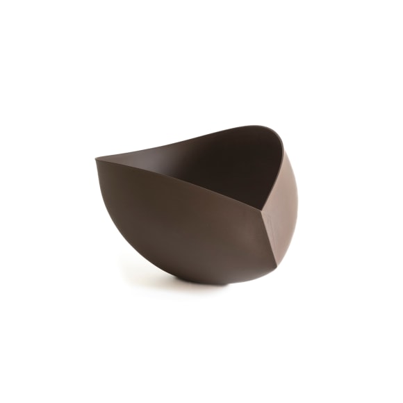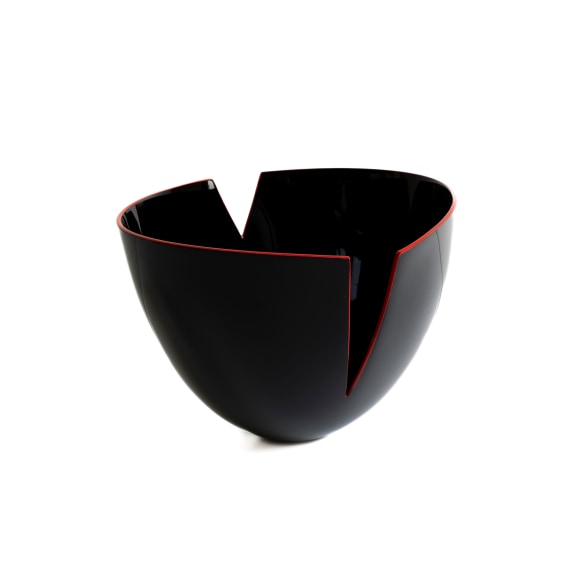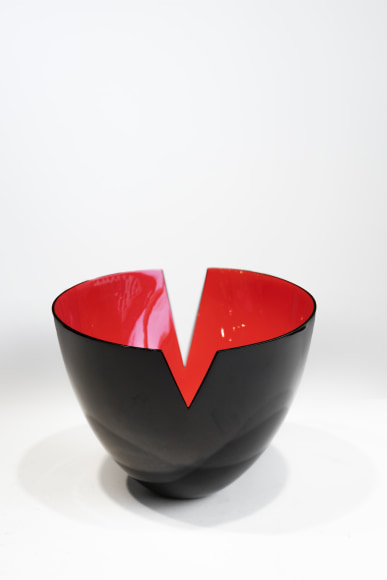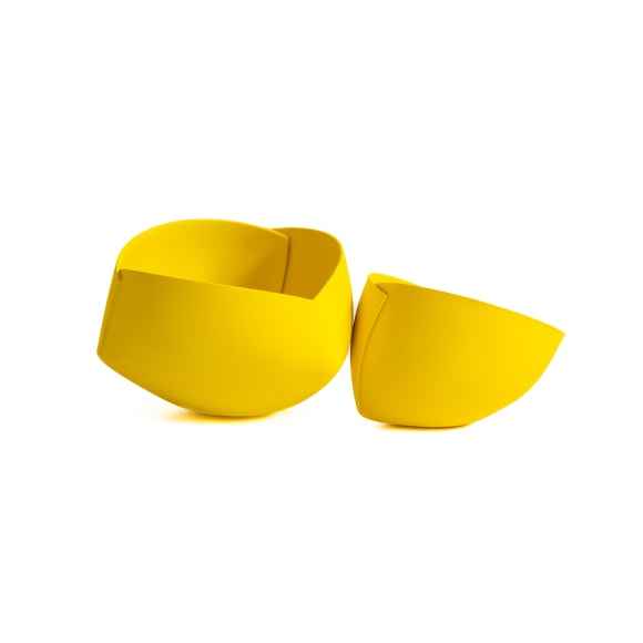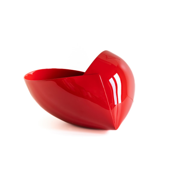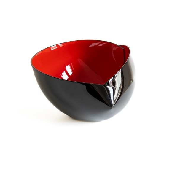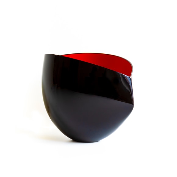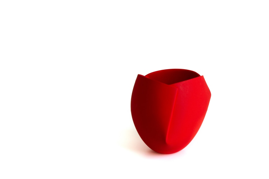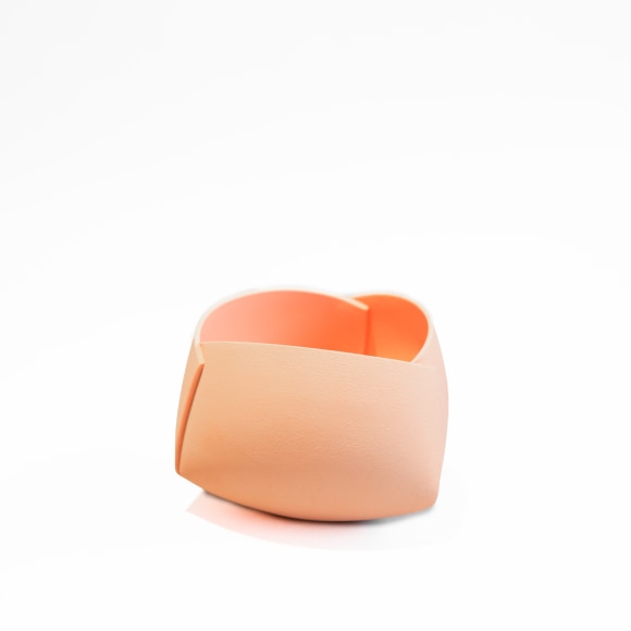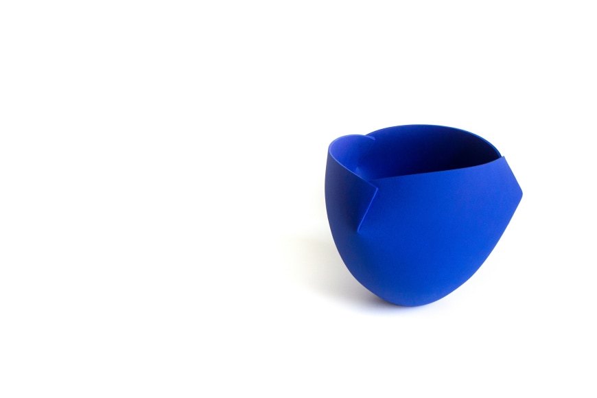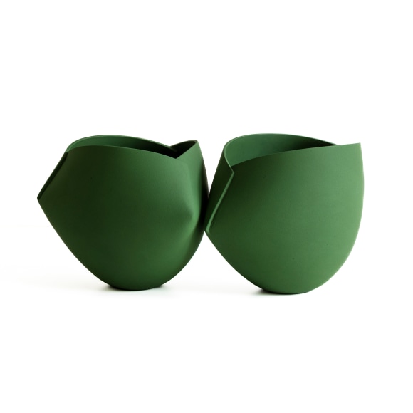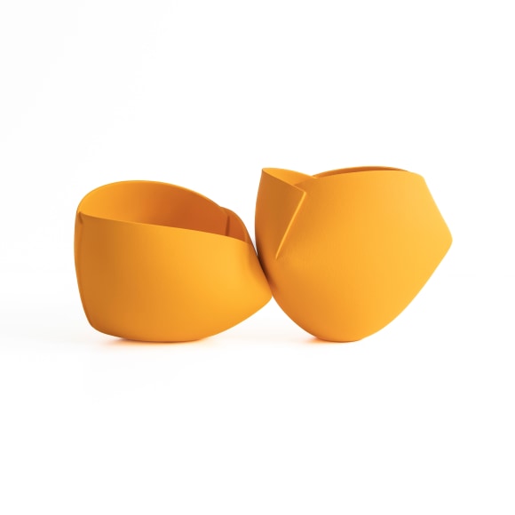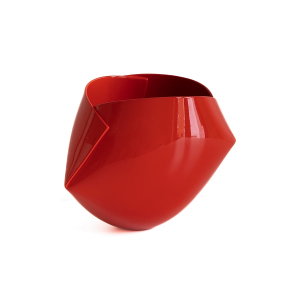 Inspired by the geometry and precision of Japanese origami, Van Hoey achieves impressive visual strength and clarity in her pieces of meticulously folded ceramic. The ancient process of producing earthenware vessels is fused with a strikingly unexpected surface of Ferrari car paint, combining traditional materiality with industrial innovation, ultimately inviting reflection on the balance between craftsmanship and capitalistic consumerism.