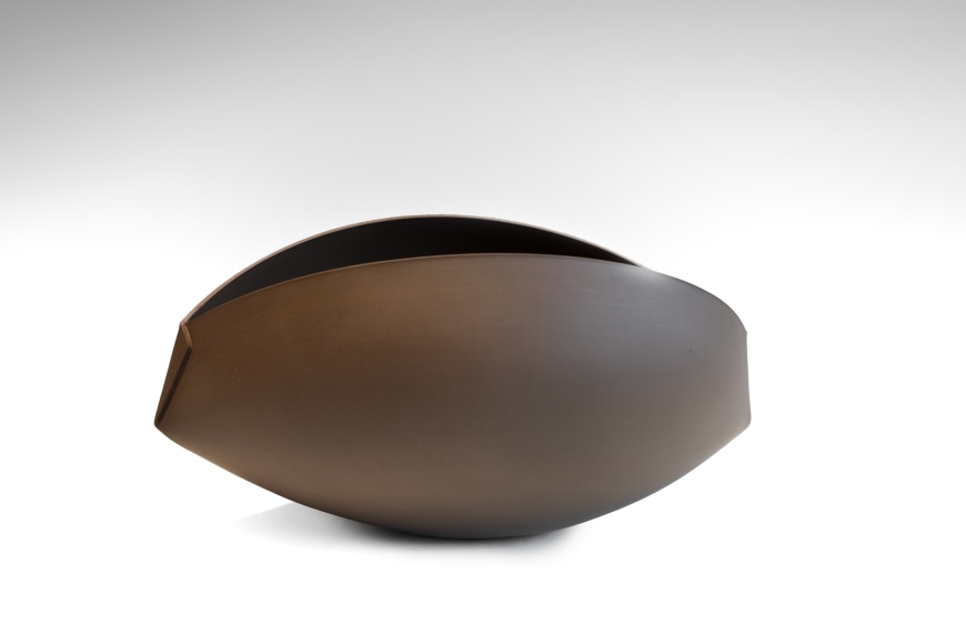 Using different clay bodies and slips, her sculptural vessels speak a language of their own. The surfaces may have the high polish of a Ferrari, or the matte quality of the earth, or the sensibility of colored candy. Though a lot of calculation goes into the process, the art is in the cutting and folds, which make the composition.