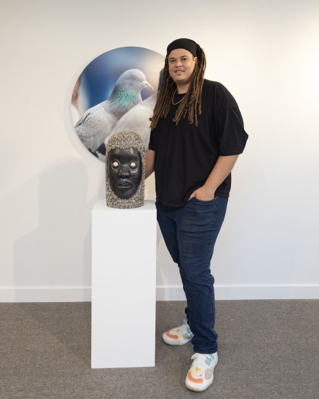 The artist uses the pigeon as a symbol for the African Diaspora, which like the bird, spread all over the world and were domesticated. Most cities have feral pigeons. Once they are free, they are seen as a problem. The bust is covered with meticulously carved sculptured feathers with wings on the side.
