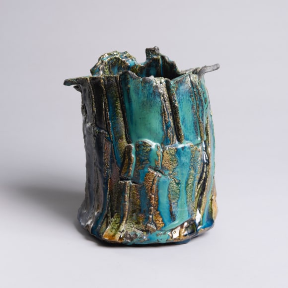 This is the first time that Shapiro will show works from two new series: Oribe Reborn and Ice Flow. Seemingly different in surface color and effect, the two series have much in common. Both are fired first in the anagama tunnel kiln and then subsequently fired at least once more in other kilns with thick applications of glaze; Oribe for the green colors and a semi-translucent white glaze for the Ice Flow. Rich greens from the Oribe are difficult to obtain. Shapiro is looking for a spectrum of green from translucent mossy greens to turquoise blue which is the result of thick buildup of glaze. It is similar for the Ice Flow series as well that the glaze is pooled in the application, sometimes an inch or more in depth to create the feeling of ice flowing over stone formations. There are also a number of recent works from the anagama wood firing with the effects of heavy ash and fire.