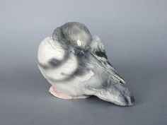 Ground Clouds’ bird and human forms speak to a central theme of the artist’s work: a deeply embedded interiority. The slightly smaller than life-size pigeons close their eyes and pull their bodies tightly inward, one tucking its head below its wing – preening? sleeping? In a similarly tucked-up form, Ancient depicts a woman crouching low and resting her head on her arms atop a bent knee. Her large hairdo hangs downward, as do her long sleeves. Like the birds, her eyes are closed. This piece’s clothing and hairstyle seems to reference Japanese figurative sculpture. Though the work is called Ancient, perhaps referencing ancestors in Takamori’s own Japanese heritage, the woman’s expression is deeply familiar, her concentration and pursed lips cutting across the fog of generations. As mist descends and settles, the space between what we know and what we imagine expands. Takamori invites us to consider the gap between what we can see and what we can only imagine about these figures' interior worlds.