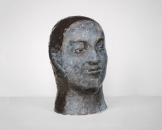 Swimmer depicts the head of a woman with long hair, looking past the viewer, seemingly absorbed in her own thoughts. Her face is articulated in a thin wash of white atop a darkly glazed surface. Is she rising from the depths of a murky pool? Surfacing from a dream? Is she about to resubmerge?