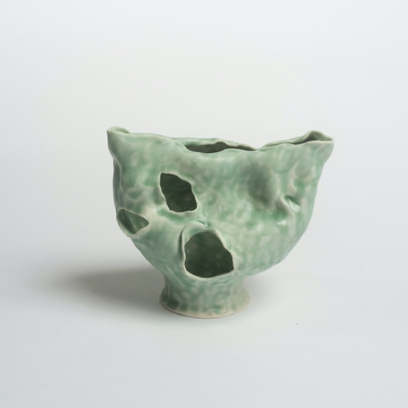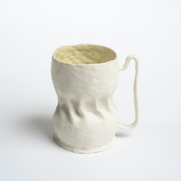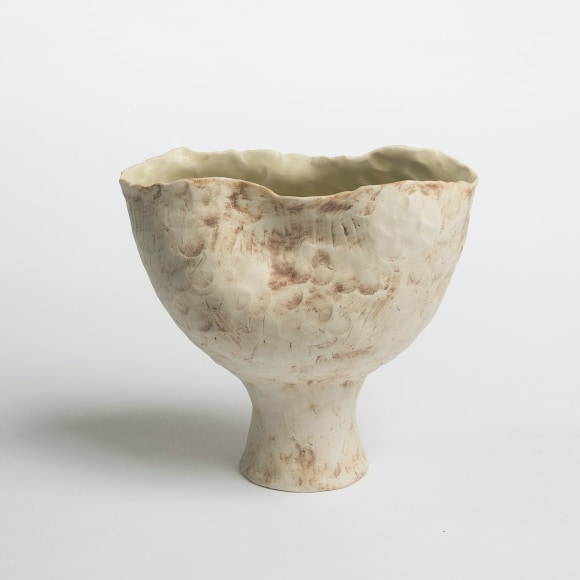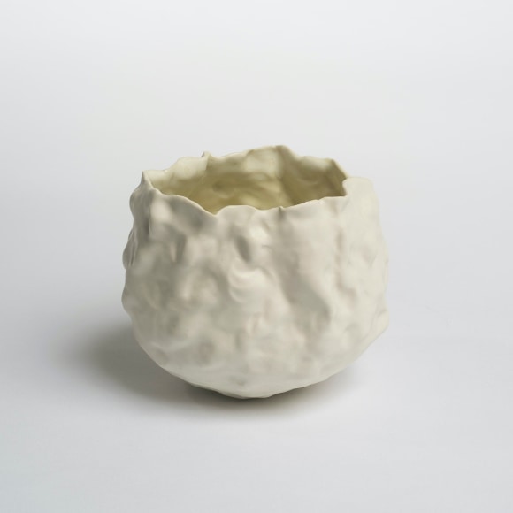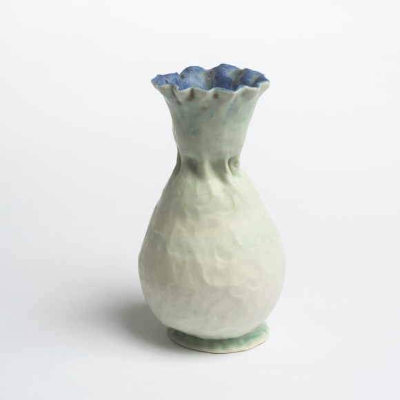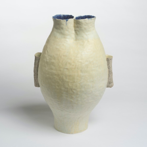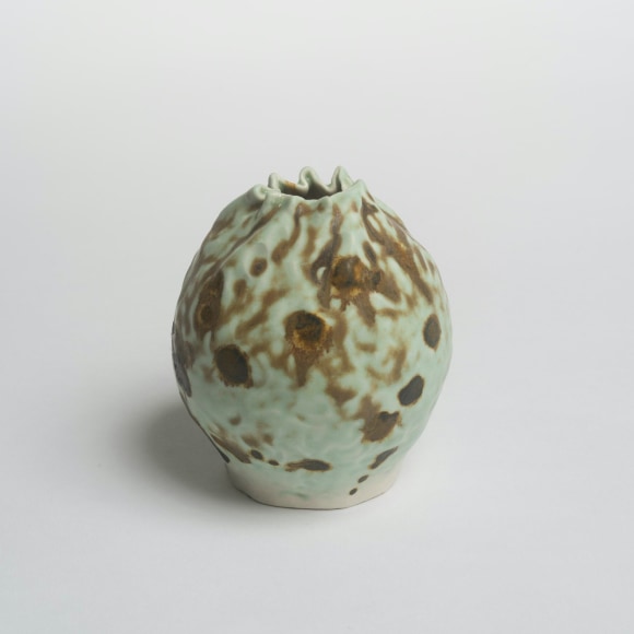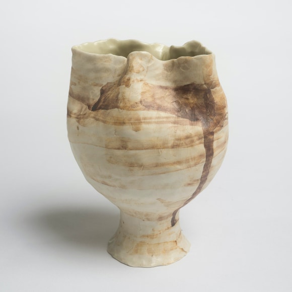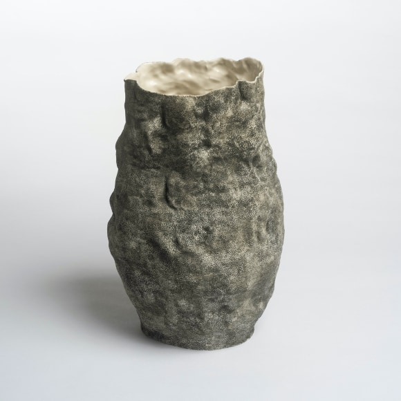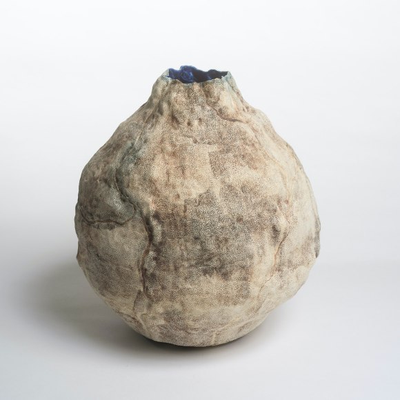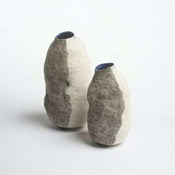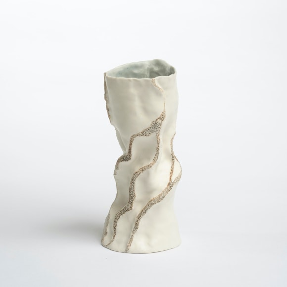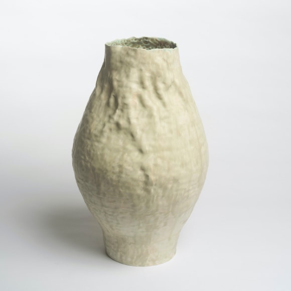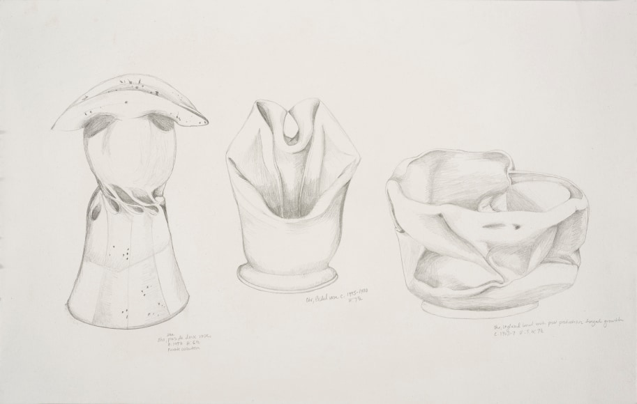 There are various ways that I touch these vessels. The first gesture that is imbued in each piece I make is the fingermark from coiling and pinching. I then alter the piece and change its form. Often pushing out from the inside of the vessel creating raised rib-like features. I squeeze parts of the exterior to create folds, and sometimes use a needle to methodically poke the surface and create a new texture that emphasizes the pinch. I am continually reminded of how Ohr claimed his clay gestures in his lifetime while I continue to develop my own in mine.