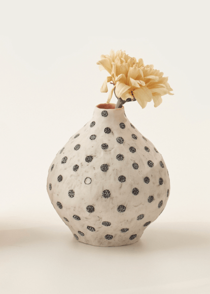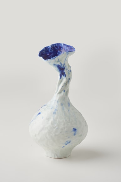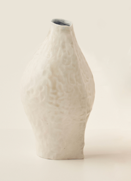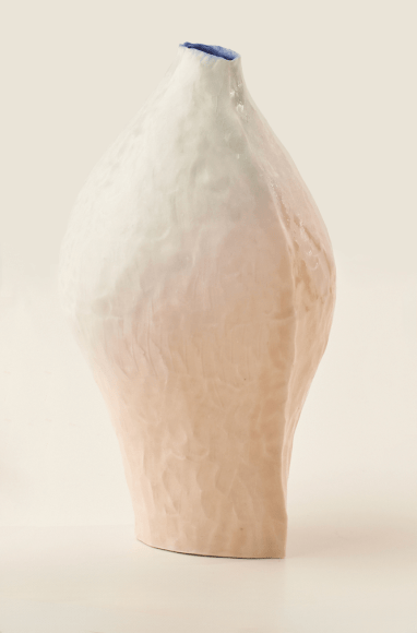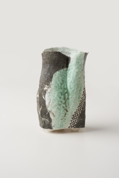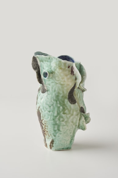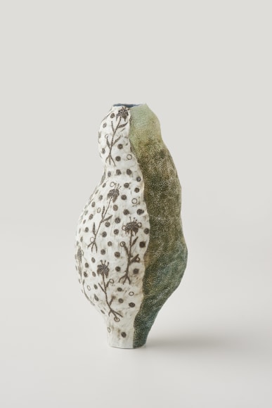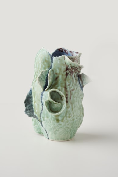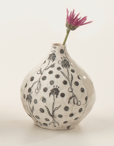 Fein’s works focus on exploring a form’s potential to convey movement and intimacy; her actual fingerprints left on each piece. She uses the vessel as a metaphor for living bodies and explores connection and touch through the forms and surfaces of the sculptures. This new work adds elements of repeated texture and pattern which evoke further complexity in emotion and meaning from a vessel. Finding a home in New Orleans, Louisiana has led to an appreciation of the colorful architecture and whimsy of the city, which has seeped into this work, adding an element of playfulness and a step towards a new use of color in her pots. The appendages on these vessels are light-hearted opportunities for interaction. Sometimes it seems with just one more breath from the pot a new opening emerges.
