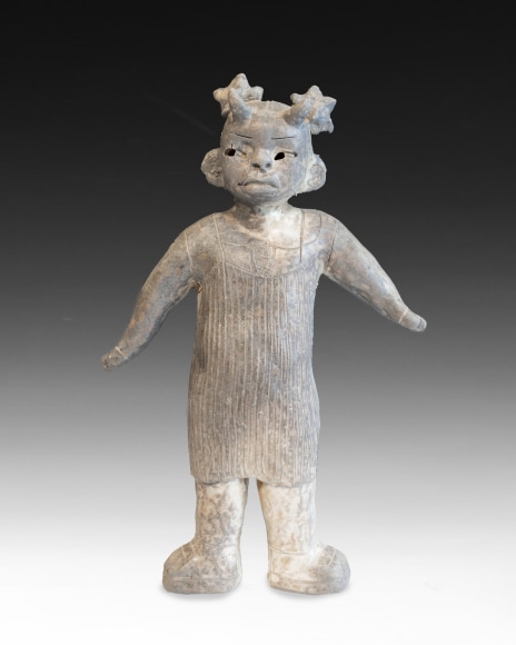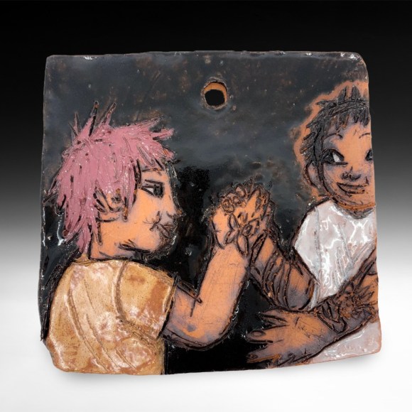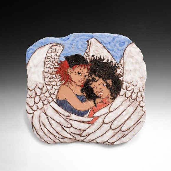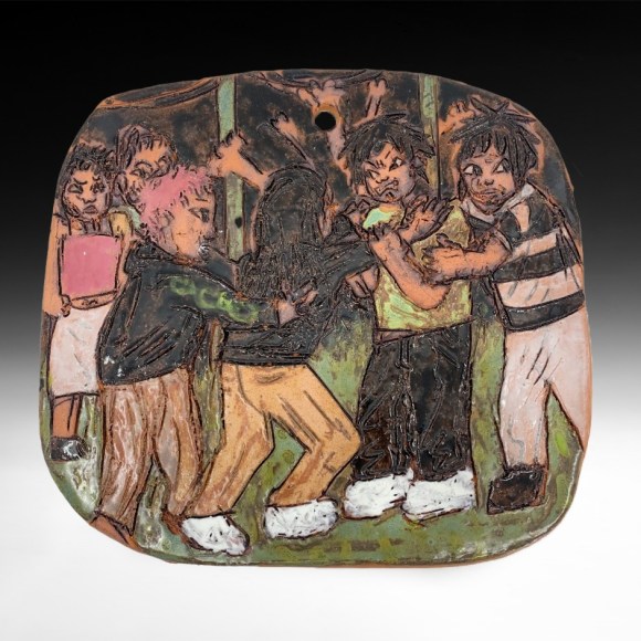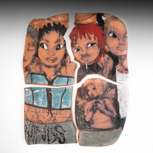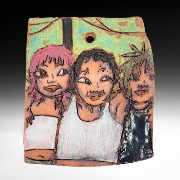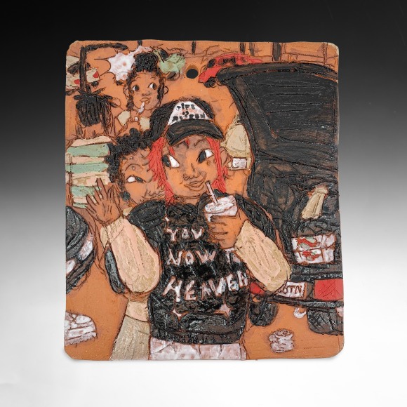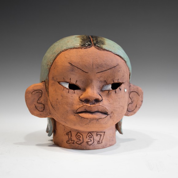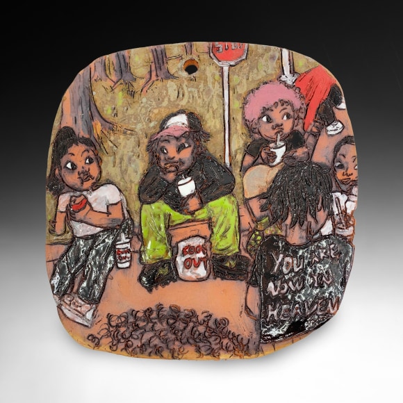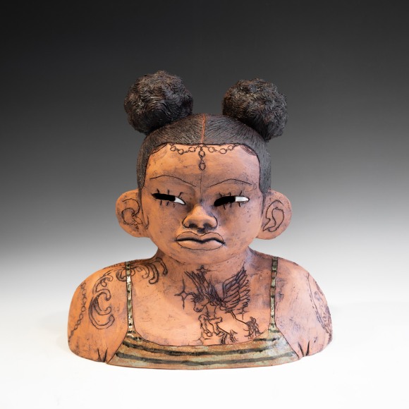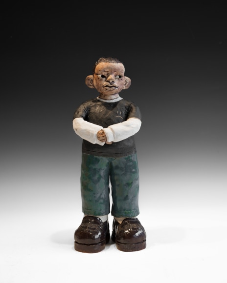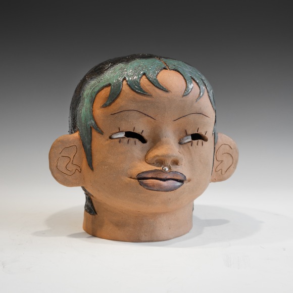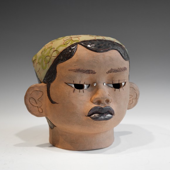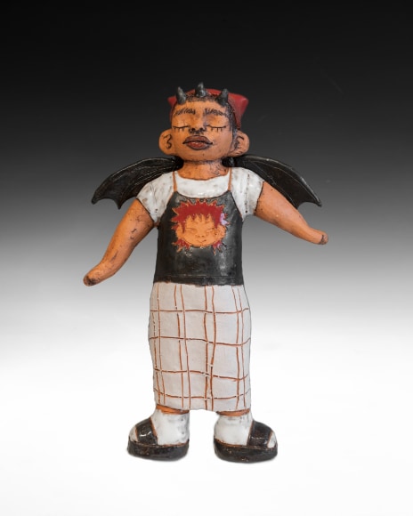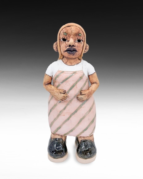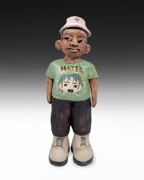 Sydnie’s ceramic figures as a collection, form a community of characters that interact with the style, joy, and sadness each member represents. She continues to draw inspiration from her childhood in north Georgia. While each of her ceramic figures is a unique personification, they also relate as though part of the same community into which we view the members poignant experiences of what it is like to be a person of color in a white dominated culture.