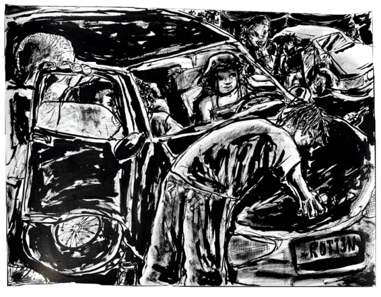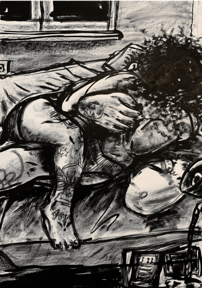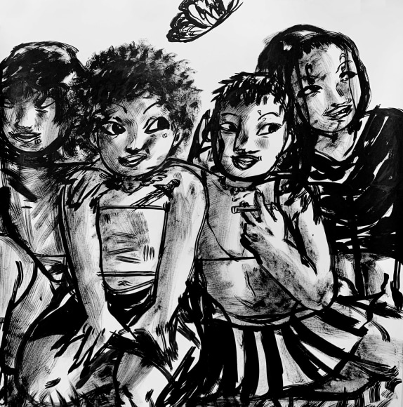 Born of a white mother and a Dominican father, Sydnie and Haylie’s art comes from the reflection on what it is like to grow up mixed race in a European centered culture. Above all, their work is about attitude. With the rebellious, suspicious nature of their figures the duo shows the ‘tough,’ ‘angry’ or ‘bitchy’ demeanors that black and brown femmes take on or are projected onto as a defense mechanism, as well as the radical joy and the deep sadness that permeates their experiences.