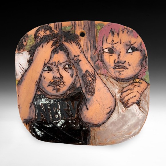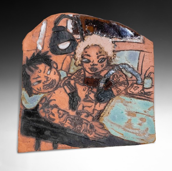 Haylie, primarily a 2-D artist expressing herself through paintings and drawings, is now moving toward a drawing and painting practice on ceramics. Her work in this exhibition is a series of drawings on glazed ceramic tiles or paper which are snapshots of memories with friends. The scenes she creates within her work are ones of endearment. Haylie writes, “Finding BIPOC Queer community in Chicago and long-lasting relationships with friends and family in Georgia was and is a pivotal influence for my work, which surrounds the importance of belonging, collective care, self-expression, and moving through hardships totimes of joy together within these communities.”