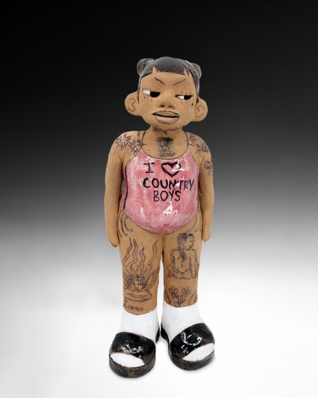 Sydnie and Haylie are a force to be reckoned with as their combined voices scroll through narratives of self-expression, identity, love, fashion, body, attitude, revolution, and LGBTQ+ identities. The subjects of their collaborative work are inspired by the essence of both sisterhood and their surroundings. We see their artistic abilities merge in the sculptures I Love Country Boys and Black Bikini with Haylie doing the tattoos on figures made and painted by Sydnie.