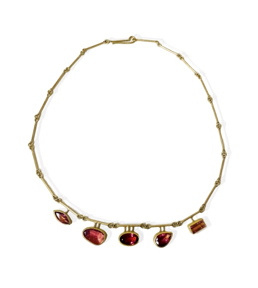 5 pink tourmaline in mixed cuts (15ct). Single, double and triple extensions 18/22k gold, 2024