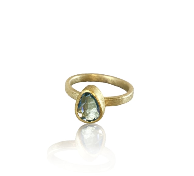 Aquamarine facetted freeform. 22/18k gold on 2.5mm band, 2024
