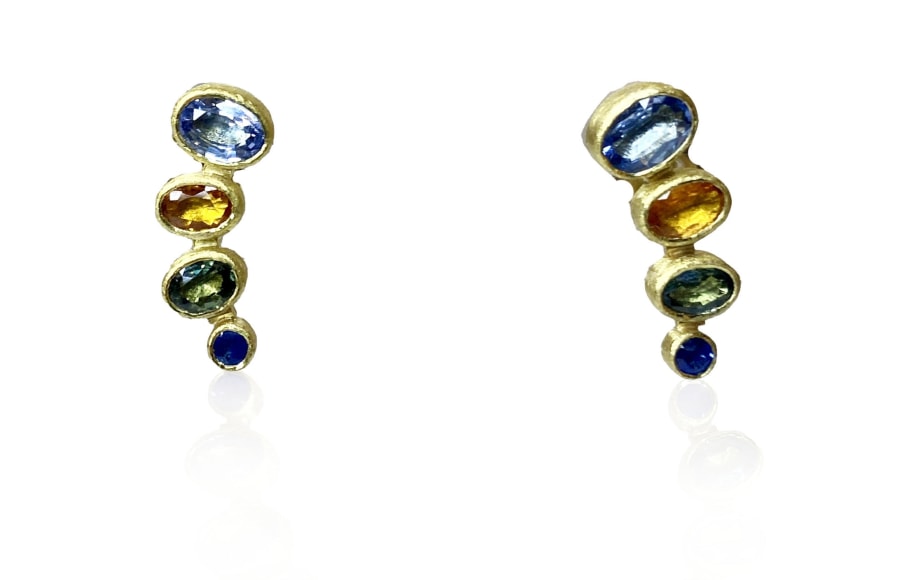Multicolored oval faceted sapphires set in climbing formation, each in 22k gold bezel with 18k backing an spacers, on post, 2024