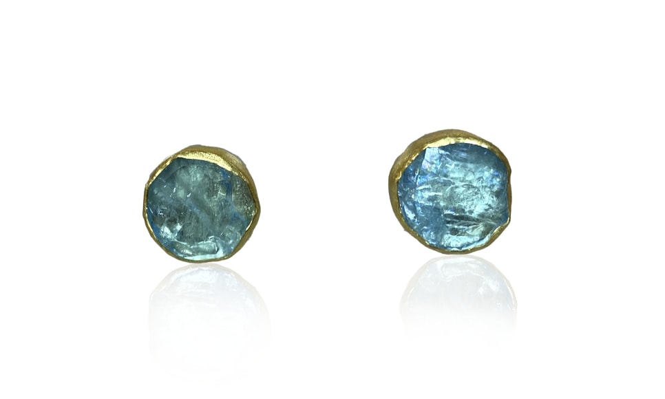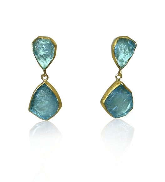 Rough aquamarine crystal drops set opposite each other, each in 22k gold bezels with 18k backing and connected by jump rings, 2024