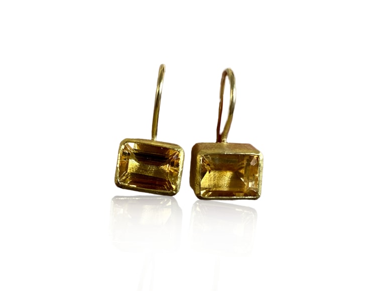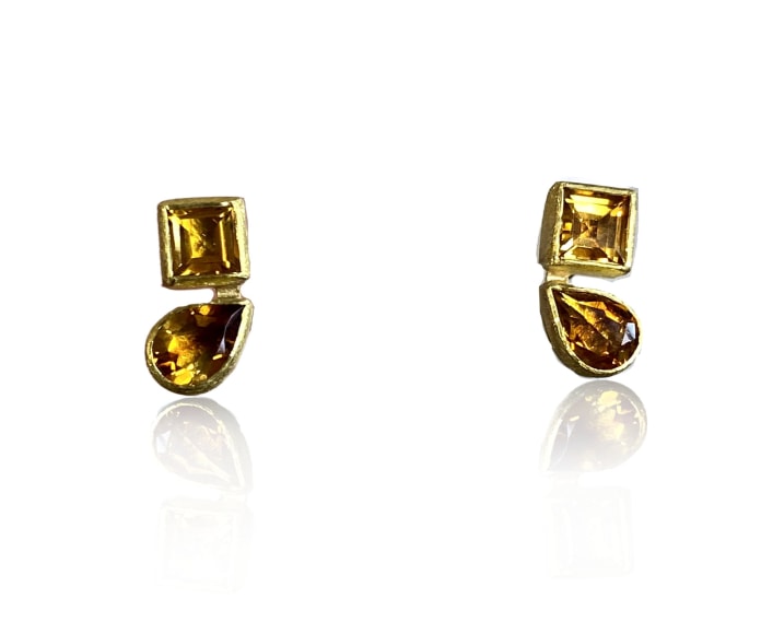 Faceted citrines, square and drop, set in 22k gold bezels separated by 18k spacer and backing/post, 2024