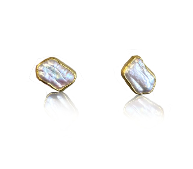 Irregular rectangular shaped freshwater white pearl set in 22k gold bezel wth 18k backing/post, 2024
