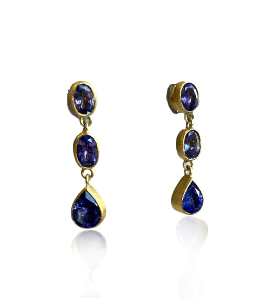 3 faceted tanzanite, 2 ovals followed by a drop, set in 22k gold bezels connected by 18k jumprings, 2024