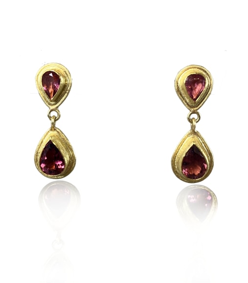 Red tourmaline faceted drops, set in 22k double bezel frame with 18k backing, jump rings and post, 2024