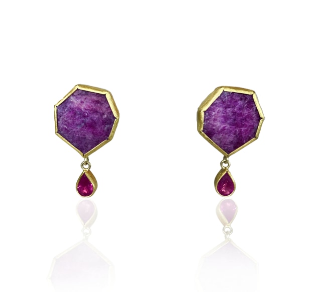 Ruby Slice Heptagon with faceted drop hanging from point, both set in 22k gold bezels with 18k backings 2024