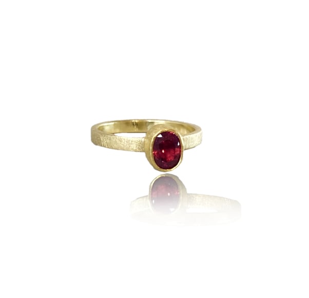 High quality ruby faceted oval set in 22k gold bezel with 18k 2.5mm band, 2024