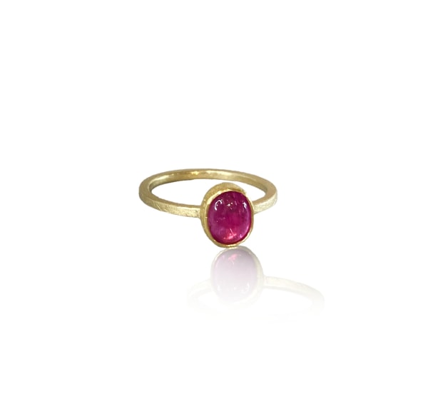 Ruby oval cabochon set in 22 and 18k gold on 1.5mm 18k square band, 2024