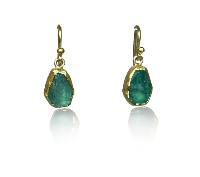 Rough emeralds set in 22k gold bezel with 18k backing and French wire, 2024