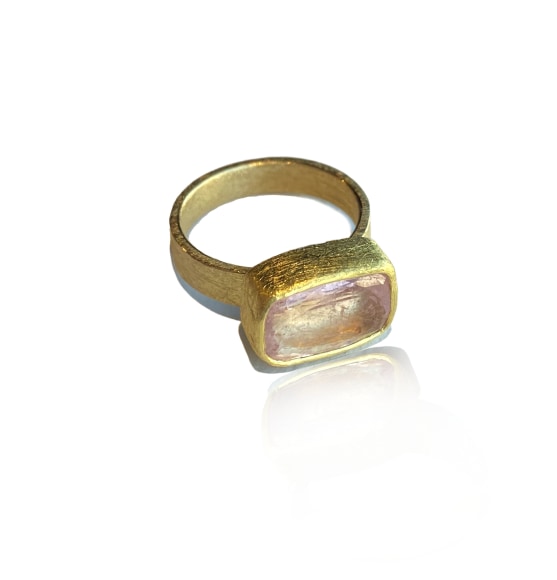 Faceted Rounded Rectangle Morganite sat east-west in 22k bezel, on 18k 4 mm band, 2024